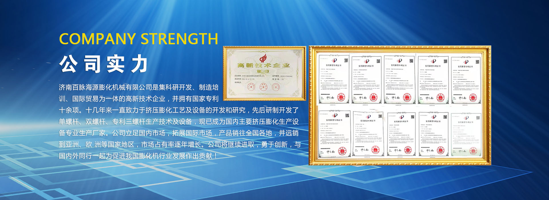济南百脉海源膨化机械有限公司是集科研开发、制造培训、国际贸易为一体的高新技术企业,并拥有国家专利十余项。十几年来一直致力于挤压膨化工艺及设备的开发和研究,先后研制开发了单螺杆、双螺杆、专利三螺杆生产技术及设备,现已成为国内主要挤压膨化生产设备专业生产厂家。公司立足国内市场,拓展国际市场,产品销往全国各地,并远销到亚洲、欧洲等国家地区,市场占有率逐年增长。公司将继续进取,勇于创新,与国内外同行一起为促进我国膨化机行业发展作出贡献!